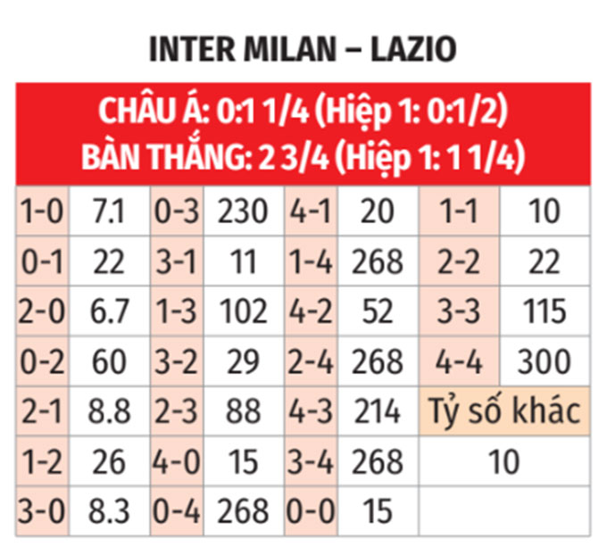 - Inter thắng theo châu Á: Ở 6 trận gần đây tại Serie A, Inter thắng theo châu Á 4 lần. Tiếp đón Lazio thua theo châu Á ở 5/7 cuộc đụng độ gần nhất giữa 2 bên, đội chủ nhà là sự lựa chọn đáng tin cậy.