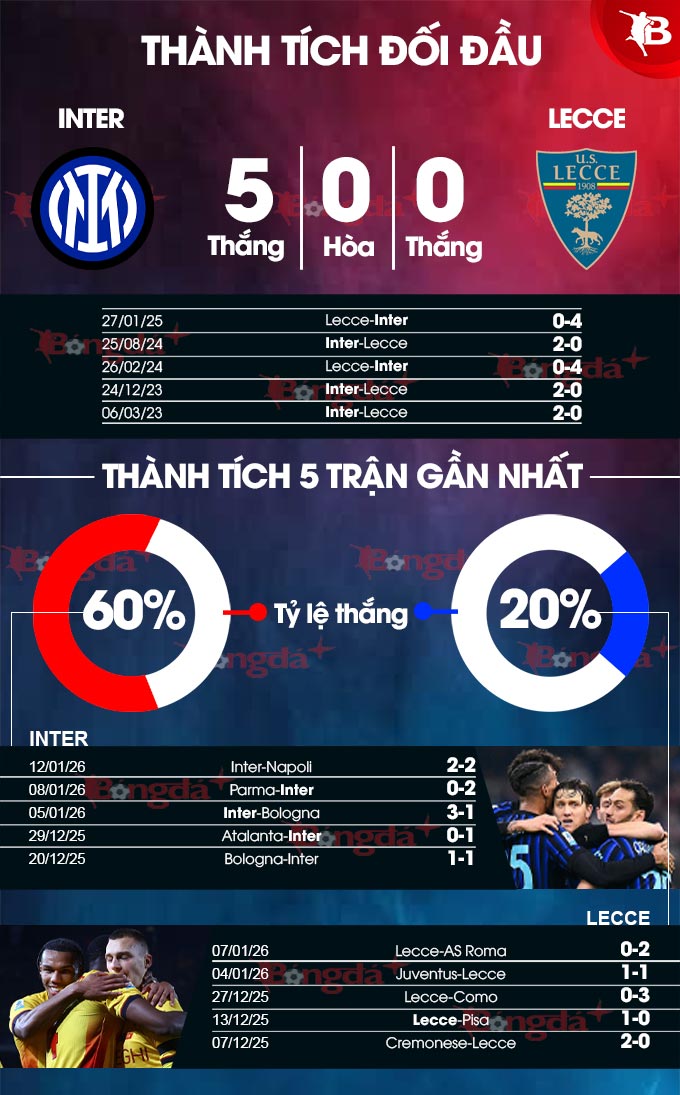 Thành tích đối đầu giữa hai đội cho thấy rõ sự thống trị tuyệt đối của Inter Milan trước Lecce trong những năm gần đây, và trong bối cảnh đang có phong độ ấn tượng gần đây, việc Neazzurri có chiến thắng không phải là điều quá bất ngờ.