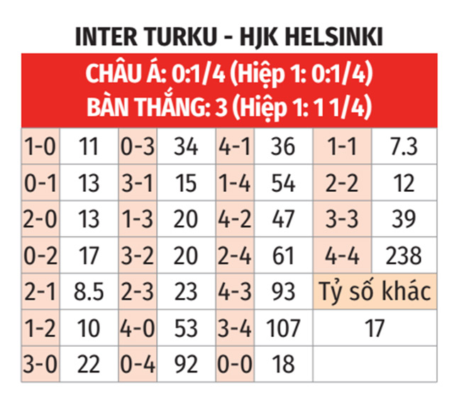 - Nhiều bàn thắng: 3/4 trận gần đây giữa Inter Turku và HJK Helsinki đều có tối thiểu 3 bàn. 3/4 trận vừa qua của HJK Helsinki cũng diễn ra theo kịch bản tương tự.