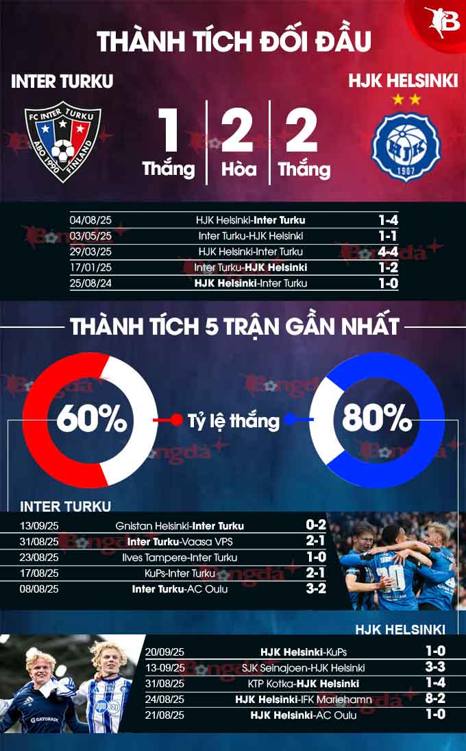 Cũng cần phải nói thêm rằng, HJK Helsinki đang được lịch sử ủng hộ khi bất bại tới 8/10 lần chạm trán Inter Turku gần đây (thắng 6, hòa 2). Với cái duyên về thành tích đối đầu như vậy, sẽ chẳng ai bất ngờ nếu họ cắt được chuỗi trận thắng liên tiếp của Inter Turku.