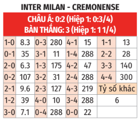 - Cremonese thắng theo châu Á: Cả 6 trận gần đây ở Serie A và B, Cremonese đều không thua theo châu Á (thắng 4, hòa 2). Inter thua theo châu Á tới 9/11 trận sân nhà gần nhất ở Serie A. Cremonese đã phần nào chứng minh được thực lực khi vẫn bất bại sau 5 vòng đầu. Inter nhường tới 2 trái chủ yếu vì lý do danh tiếng, nên cổ vũ cho Cremonese.
