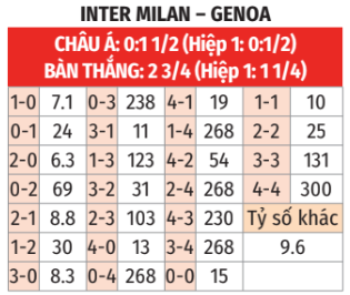 • Nhiều góc hiệp 1 chờ 4 hòa: 5/6 trận Serie A gần đây khi Inter nhường 1 bàn trở lên có 5 góc hiệp 1 trở lên, ngay ngoại lệ duy nhất (gặp Udinese) cũng phải đạt được 4 quả trước giờ nghỉ. 5/7 lần gần nhất Inter tiếp đón Genoa trên sân Giuseppe Meazza cũng xuất hiện 5 góc hiệp 1 trở lên. Cẩn thận hơn cả nên chờ tỷ lệ hạ xuống 4 hoặc 3,5 rồi bắt đầu cổ vũ nhiều góc hiệp 1.