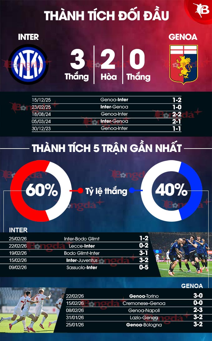 Nhận định bóng đá trận Inter vs Genoa diễn ra vào lúc 02h45 ngày 1/3 ở vòng 27 Serie A. BongdaPlus phân tích thông tin lực lượng, đội hình dự kiến, dữ liệu chuyên sâu, dự đoán tỉ số.