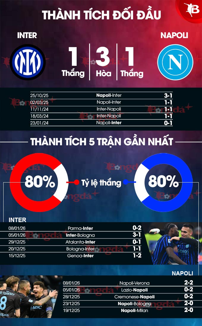 Inter luôn ghi tối thiểu 1 bàn thắng trong 14 lần gần nhất chạm trán Napoli. Lần gần nhất Napoli sạch lưới trước Inter là thắng lợi 1-0 tại Coppa Italia hồi tháng 2/2020 trên sân Giuseppe Meazza.