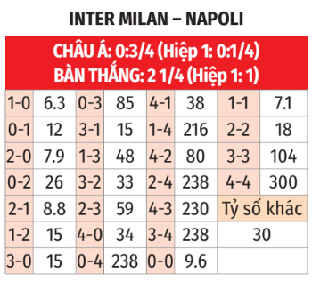- Từ 2 đến 3 bàn: 3/4 trận sân khách gần đây của Napoli có 2 đến 3 bàn. Trong 4 trận vừa qua khi Inter nhường 3/4 đến 1 ¼ bàn, 3 trận chấm dứt với số bàn thắng nêu trên. Tương tự, 4/5 lần chạm trán gần nhất giữa đôi bên ở Serie A cũng có 2 đến 3 lần lưới rung.