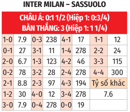 - Sassuolo thắng theo châu Á: Sassuolo thắng theo châu Á 9/11 trận chính thức gần đây trên sân khách với điều kiện theo châu Á khác 0, bất kể khi họ là cửa trên hay cửa dưới. Inter thua theo châu Á tới 8/10 trận sân nhà vừa qua tại Serie A, đồng thời thua kèo tới 8/9 lần gần nhất tiếp đón Sassuolo trên “thánh địa” Giuseppe Meazza. Cùng lắm Inter cũng chỉ có thể thắng sát nút.