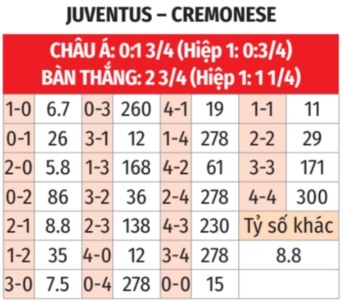 - Tối đa 1 bàn hiệp 1: 3 lần chạm trán giữa 2 đội gần đây đều có không quá 1 bàn trong hiệp 1. Tình trạng tương tự xảy ra ở 8 trận gần đây của Juventus và 5/6 trận mới nhất của Cremonense.