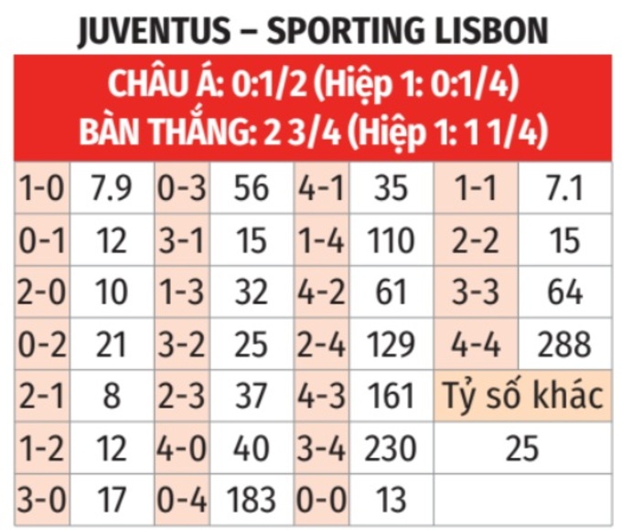 - Cả trận không quá 2 bàn: 3 lần đối đầu giữa 2 đội gần đây chỉ có nhiều nhất 2 bàn thắng. 6/9 trận gần đây của Juventus cũng chỉ có tối đa 2 bàn. Trận đấu mới nhất của Sporting Lisbon xảy ra tình trạng tương tự.