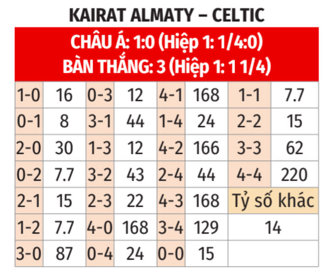 - Lẻ bàn thắng: 5/6 trận gần nhất của Kairat Almaty và 5/8 chuyến làm khách vừa qua của Celtic (không tính giao hữu) đều khép lại với tổng bàn thắng là lẻ. Ngoài ra, 7/10 trận sân nhà gần đây của Kairat Almaty cũng có tổng bàn thắng không chia hết cho 2. Trận này khó có ngoại lệ.