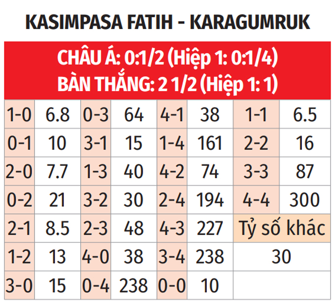 Chưa hết, Kasimpasa bất bại trước Karagumruk ở 4 trận gần nhất khi thắng 2, hòa 2. Riêng 7 trận gần nhất khi Kasimpasa tiếp Karagumruk trên sân nhà, họ thắng 4, hòa 2 và thua 1. Khả năng cao 3 điểm sẽ về tay Kasimpasa.