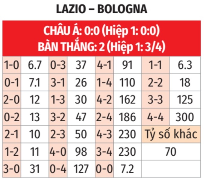 - Tối thiểu 1 bàn hiệp 1: 7/10 lần gặp giữa 2 đội gần đây có từ 1 bàn trở lên trong hiệp 1. 6/8 trận sân nhà gần đây của Lazio và 3 trận vừa qua của Bologna tương tự.