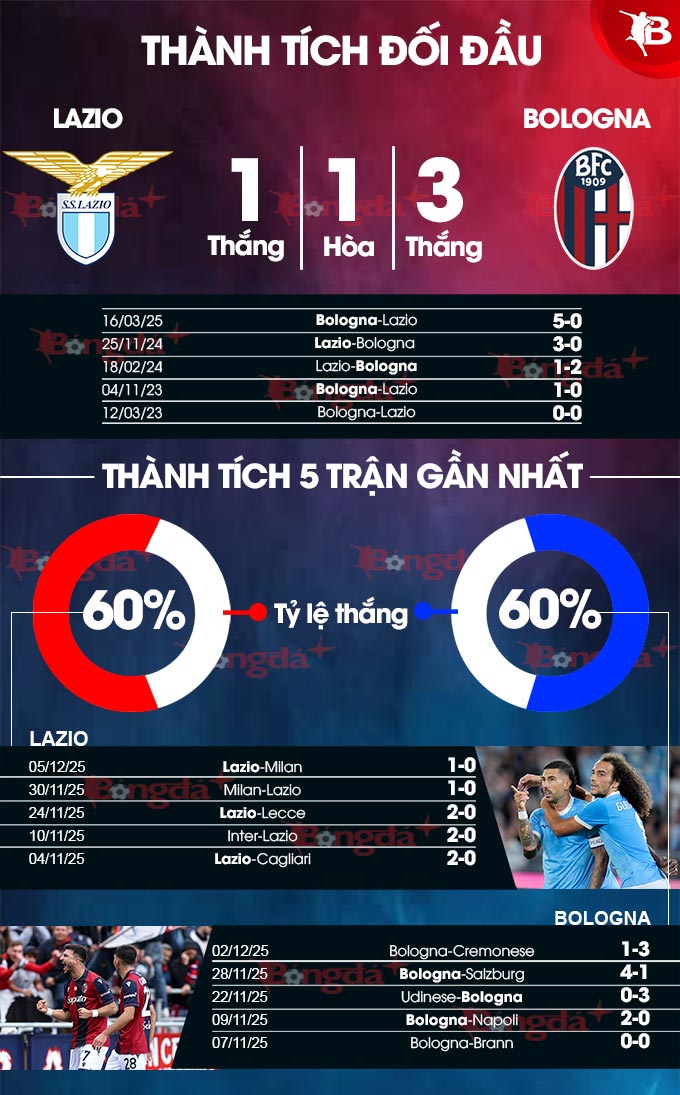 Quá khứ cũng cho thấy, Lazio luôn át vía Bologna trong những lần tiếp đón gần đây ở Olimpico. Cụ thể, trong 7 lần nghênh đón đối thủ này tại Rome, họ áp đảo khi giành tới 6 chiến thắng. Trong đó, ở lần gần đây nhất, họ đánh bại Bologna trên sân Olimpico với tỉ số 3-0.