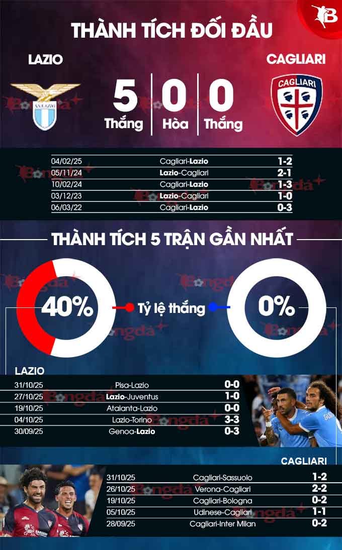 Trong quá khứ, Cagliari cứ mỗi lần gặp Lazio là lại như "cua gặp ếch". Với phong độ kém cỏi như hiện tai, rất khó để kỳ vọng họ sẽ phá "dớp" thường xuyên bị Lazio bắt nạt.