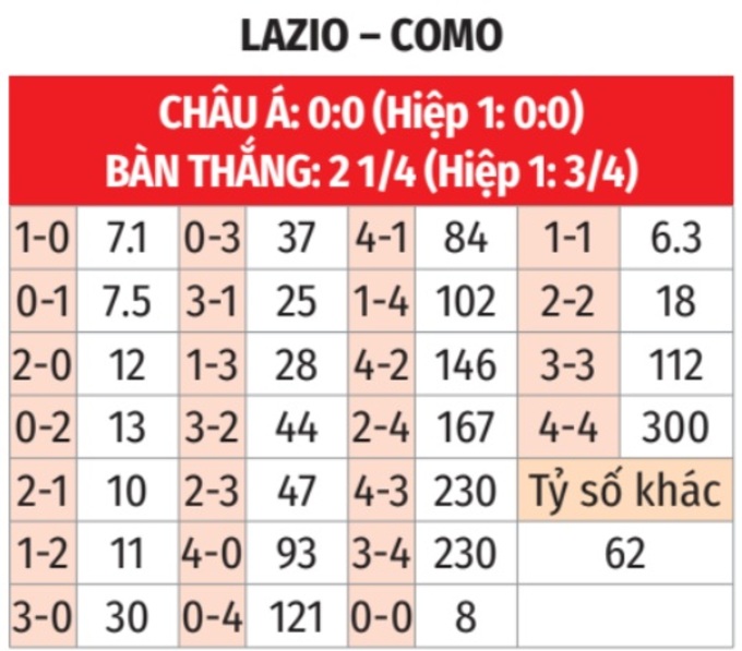 - Tối đa 2 bàn thắng: 2 lần chạm trán giữa 2 đội gần đây đều kết thúc với không quá 2 bàn thắng. Tình trạng tương tự xảy ra ở 14/15 trận gần đây của Lazio. Como không ghi quá 1 bàn ở 3/4 trận gần đây và trận này lại đá sân khách.