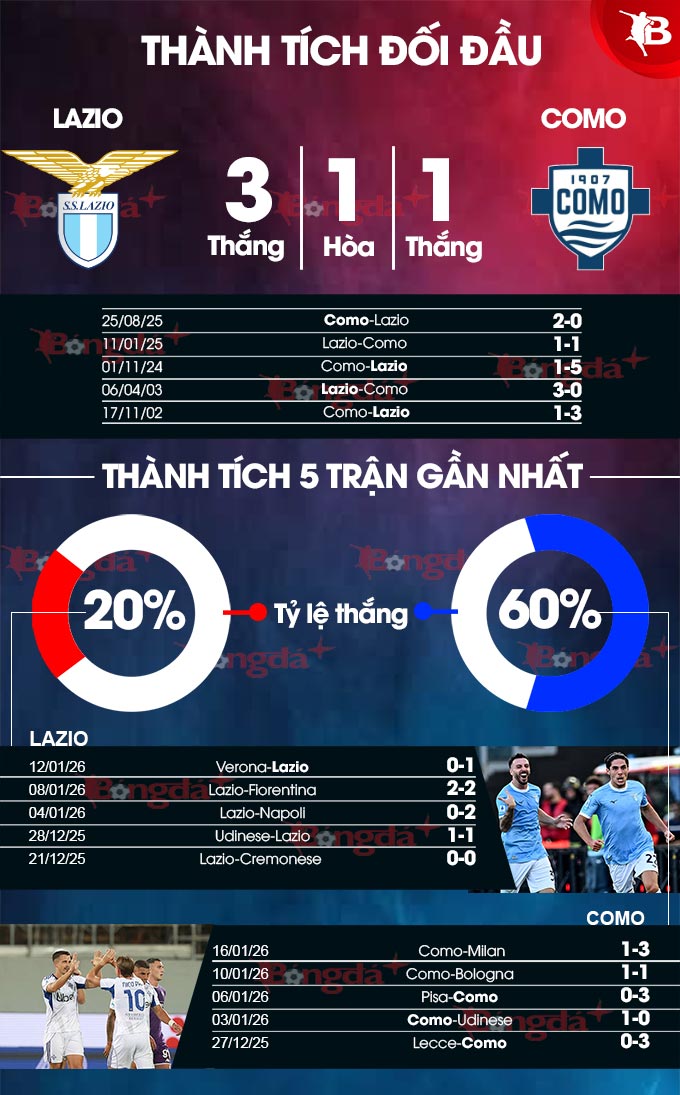 Lazio gần đây thi đấu không tốt. Theo thống kê, họ chỉ thắng được 1/5 trận đấu gần đây ở Serie A. Những kết quả kém ấn tượng ấy khiến đội bóng thành Rome tụt xuống vị trí thứ 9 tại bảng xếp hạng Serie A. Vì thế, Lazio rất muốn tận dụng lợi thế sân nhà để giành 3 điểm trước đối thủ Como nhằm cải thiện thứ hạng.