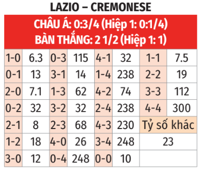 - Lazio thắng theo châu Á: Lazio nhường Cremonese 3/4 bàn là hơi sâu bởi phong độ khá xoàng của đội bóng thủ đô mùa này, bản thân Lazio chỉ hơn đối thủ 2 điểm trên BXH. Cremonese thua 3/4 trận Serie A gần đây khi được nhường 1/2 đến 1 bàn. Lazio bất bại theo châu Á cả 5 trận sân nhà vừa qua ở giải chính thức (thắng 4, hòa). Lazio toàn thắng cả 3 lần đối đầu gần nhất, đội bóng của HLV Sarri sẽ giành 3 điểm.