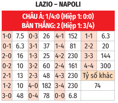 - Napoli thắng theo châu Á: Lazio thua theo châu Á 4/5 trận gần đây tại Serie A, mùa này chỉ trừ trận thắng Juve đang khủng hoảng 1-0, Lazio đã thua tất cả các đối thủ lớn như Milan, Inter và Roma. Napoli lại thắng theo châu Á 4/5 trận vừa qua ở các giải đấu nội địa. Đá sân khách vẫn nhường 1/4 bàn cho thấy Napoli được đánh giá rất cao, đội khách sẽ giành 3 điểm.