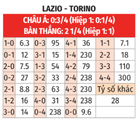 - Lazio thắng về phạt góc: Lazio thắng về phạt góc cả 4 trận sân nhà gần đây tại Serie A khi nhường đối phương nửa trái trở lên. Torino thua phạt góc 9/10 trận sân khách vừa qua ở Serie A khi được nhường 1/4 đến 1 trái.
