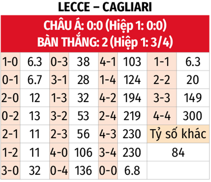 - Tối đa 1 bàn hiệp 1: 7 trận đối đầu gần nhất giữa hai đội đều kết thúc hiệp đầu tiên với nhiều nhất 1 bàn thắng. 11 trận liên tiếp vừa qua của Lecce cùng 8 trận gần đây của Cagliari cũng có không quá 1 bàn trước giờ nghỉ.