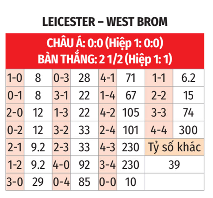 - Tối thiểu 3 bàn: 5/6 trận gần đây giữa Leicester và West Brom đều có tối thiểu 3 bàn. 11 trận gần nhất của Leicester cũng diễn ra theo kịch bản tương tự.