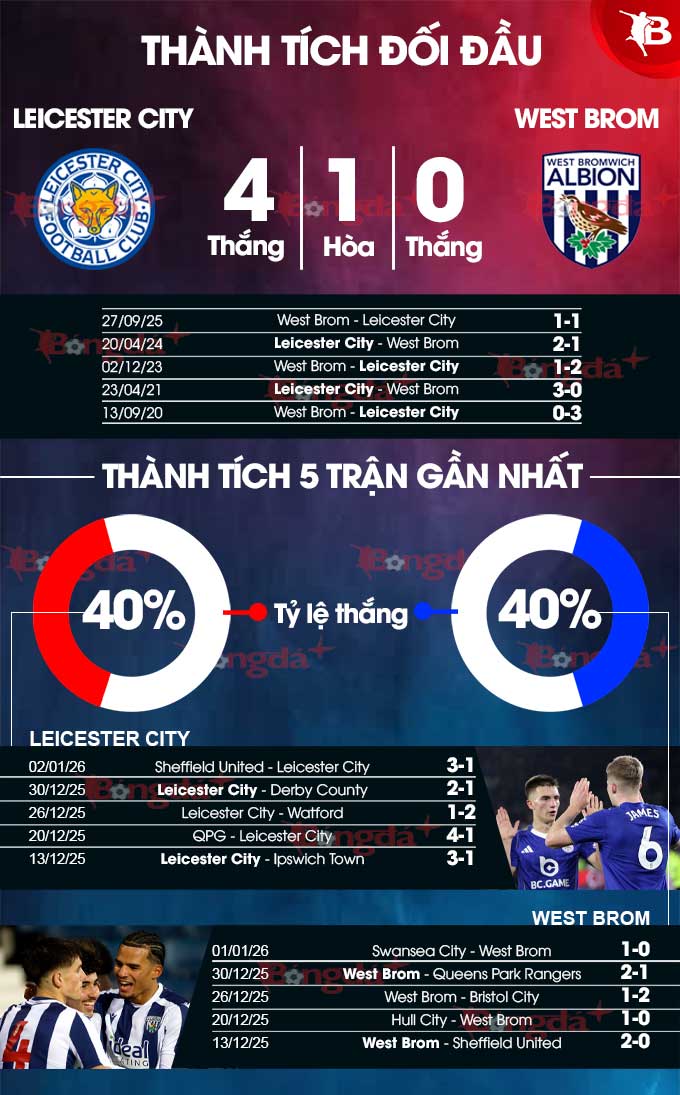 Vốn đã vô duyên trên sân khách như vậy, West Brom còn gặp thêm khó khăn khi đụng phải Leicester hoàn toàn vượt trội về thành tích đối đầu. Bằng chứng là trong 9 cuộc đụng độ gần đây giữa 2 bên, West Brom đều không hạ nổi Leicester và họ phải nhận tới 6 thất bại. Do West Brom rất hay bị Leicester bắt nạt, sẽ chẳng bất ngờ nếu họ lại một lần nữa phải đón nhận kết quả không như ý.
