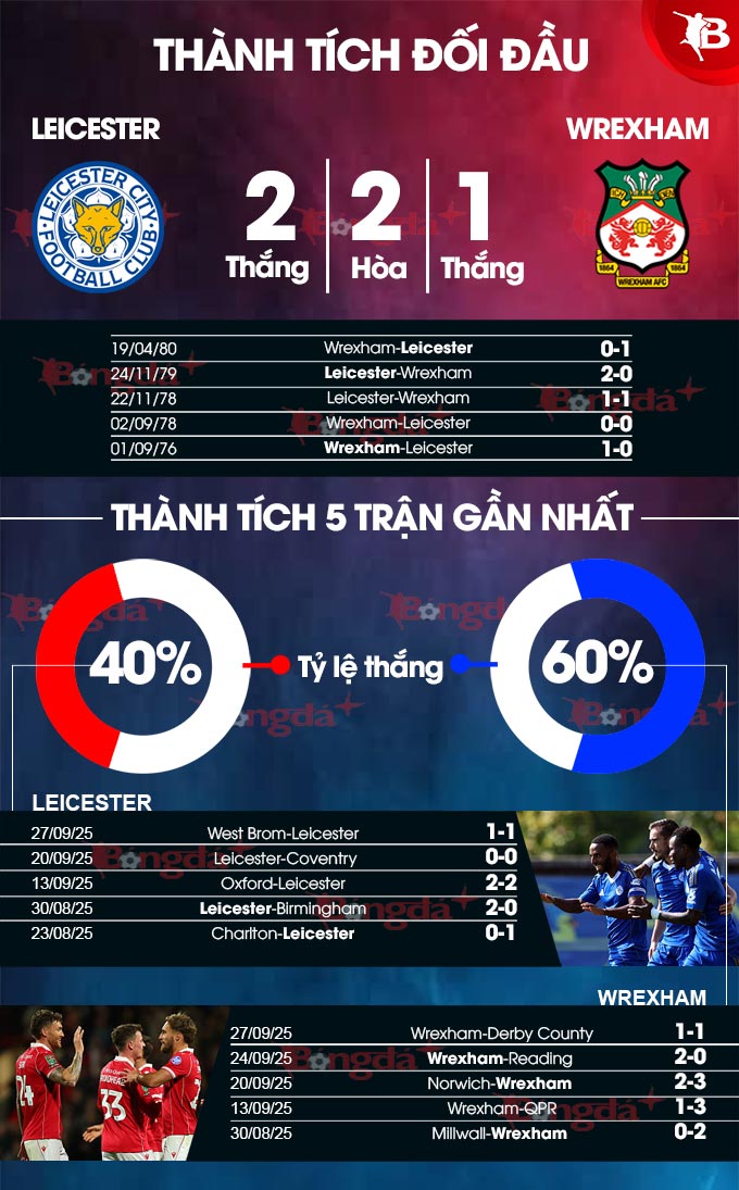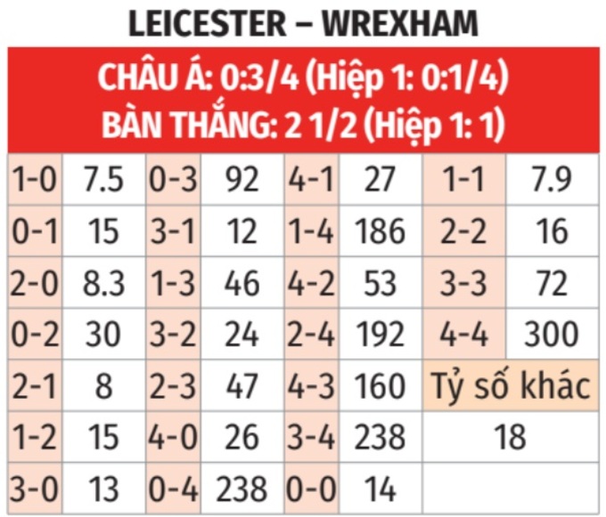 - Nhiều bàn thắng hiệp 1: 3/4 trận đấu gần đây của Leicester đều có từ 1 bàn thắng trở lên trong hiệp 1. Tình trạng tương tự xảy ra ở 3/4 trận đấu sân khách vừa qua của Wrexham.