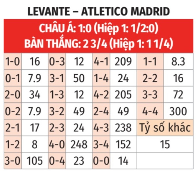 - Ít góc hiệp 1: 6/8 trận đấu gần đây của Levante chỉ xuất hiện nhiều nhất 4 quả phạt góc trong hiệp 1. Tình trạng tương tự xảy ra ở 3/4 trận đấu vừa qua của Atletico.