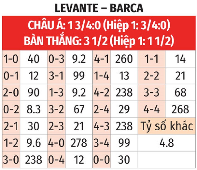 - Barca thắng kèo hiệp 1: Các cầu thủ Barca đang nhập cuộc rất chủ động khi thắng theo châu á 4 trận liên tiếp vừa qua trong hiệp đầu. Levante hòa 1 và để thua kèo 2 ở 3 trận gần đây trong 45 phút đầu tiên. Barca cũng thắng kèo hiệp đầu 4/6 trận đối đầu gần nhất.
