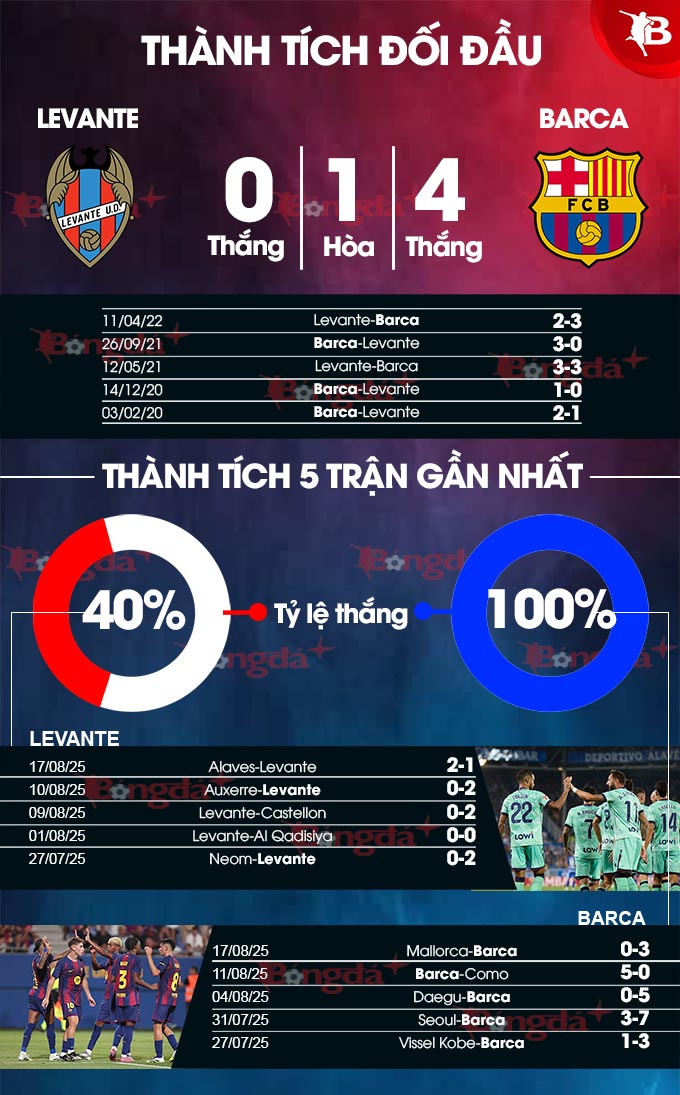 Barca đang có thành tích giành chiến thắng 17 trong 19 trận ra sân gần đây ở đấu trường La Liga. Lịch sử đối đầu cũng đang chứng kiến sự vượt trội của Barca trước Levante, khi đội bóng xứ Catalunya bất bại trong 30 trong số 33 trận gần nhất trên mọi đấu trường.