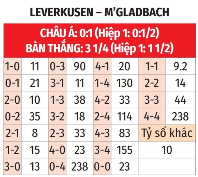 - Nhiều bàn hiệp 1: 4/6 lần gặp giữa 2 đội gần đây đều có từ 2 bàn thắng trở lên trong hiệp 1. 3/4 trận gần đây của Leverkusen và 5/7 trận sân khách vừa qua của M’gladbach xảy ra tình trạng tương tự.
