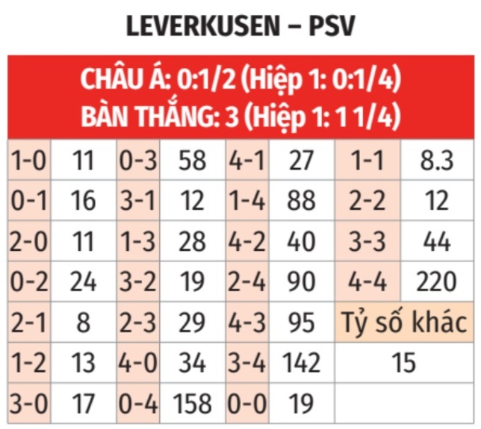 - Nhiều bàn thắng hiệp 1: 5/6 trận đấu gần đây của Leverkusen đều có từ 2 bàn thắng trở lên trong hiệp 1. Tình trạng tương tự xảy ra ở 4 trận đấu gần nhất của PSV.