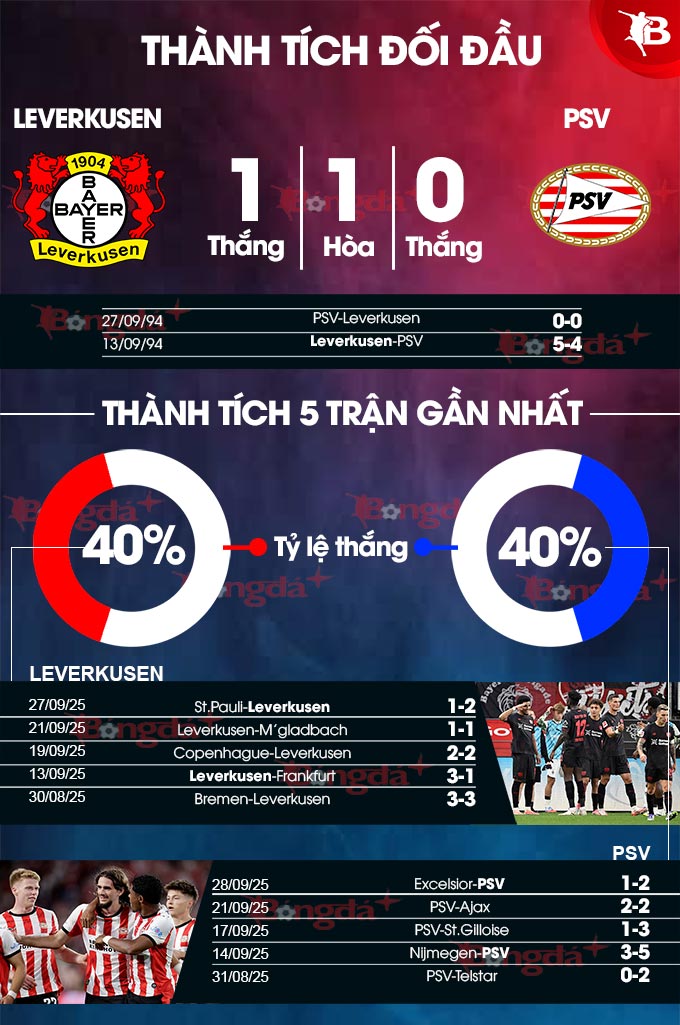 - Chẵn bàn thắng: 13/14 trận đấu gần đây của Leverkusen kết thúc với tổng số bàn thắng là số chẵn. 6/7 trận vừa qua của PSV cũng khép lại với kết quả chẵn bàn thắng.