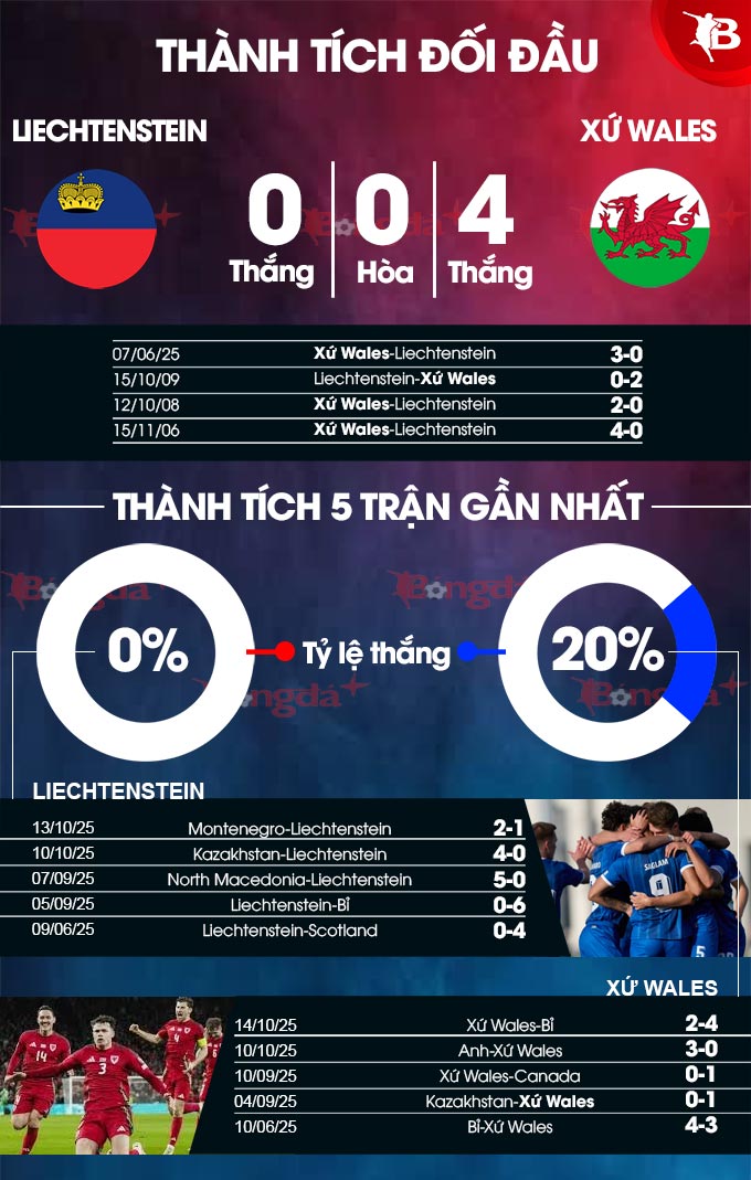 Thậm chí trên sân nhà, Liechtenstein cũng thia cả 5 trận gần nhất trong đó 4 trận gần đây không ghi được bàn nào và đều thủng lưới từ 2 bàn trở lên. Đây là cơ hội tuyệt vời để Xứ Wales tìm lại niềm vui chiến thắng sau 3 thất bại liên tiếp trên mọi đấu trường.