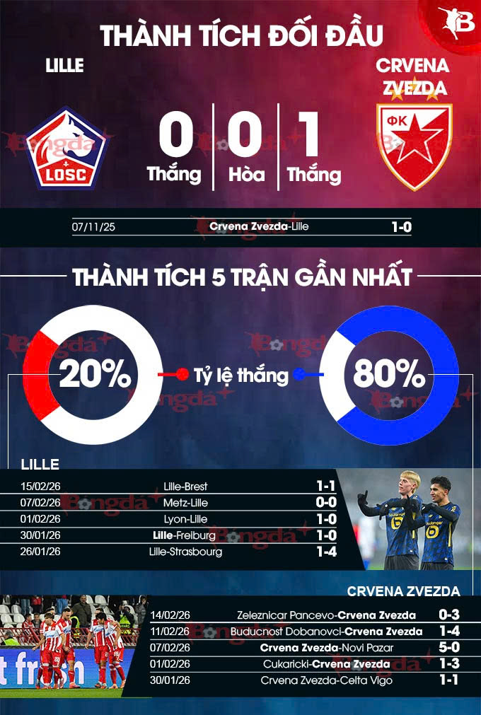 Với rất nhiều lợi thế về phong độ, lực lượng, đội khách Crvena Zvezda nhiều khả năng sẽ đem lại niềm vui cho giới mộ điệu tin tưởng vào họ theo châu Á và ghi bàn ngay trong hiệp 1 tại sân Pierre-Mauroy của Lille.