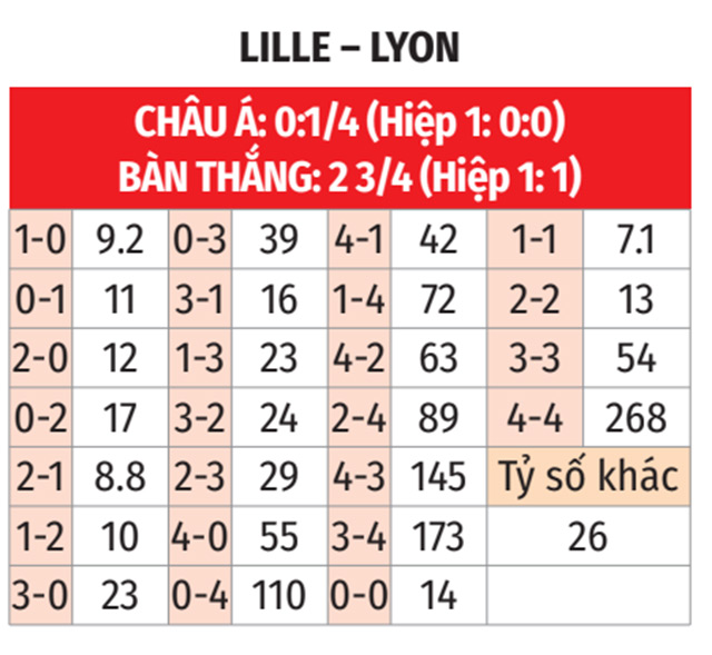 - Tối thiểu 3 bàn: 5/7 trận gần đây giữa Lille và Lyon đều có tối thiểu 3 bàn. 5/6 trận vừa qua của Lille cũng có diễn biến tương tự.