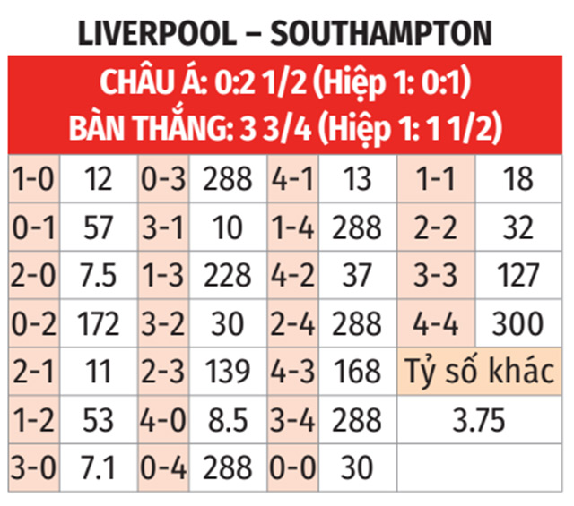- Tỷ số lẻ: 3/4 trận gần đây giữa Liverpool và Southampton kết thúc với tỷ số lẻ. Cả 5 trận vừa qua của Liverpool cũng có số bàn thắng chia hết được cho 2.