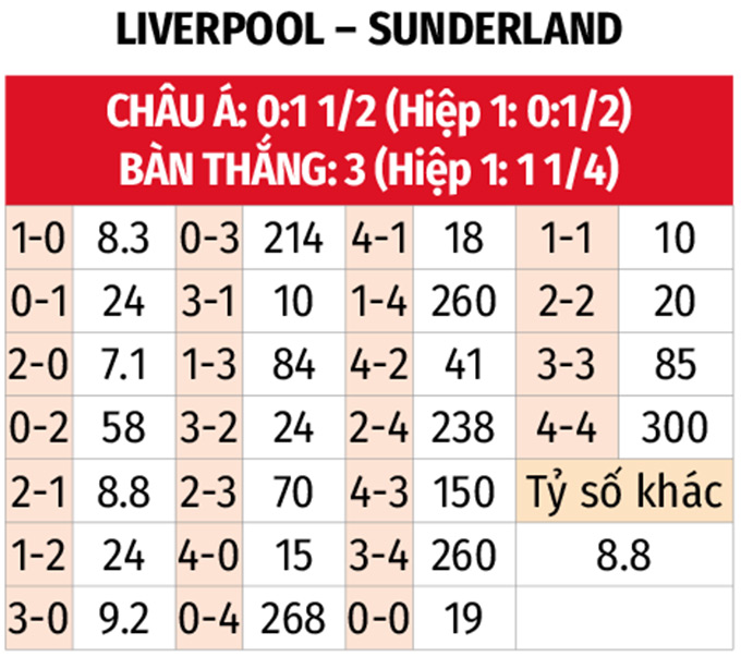 - Sunderland thắng châu Á hiệp 1: Liverpool toàn thua theo châu Á 5 trận liên tiếp gần đây trong hiệp đầu tiên. Với Sunderland, đội khách thắng châu Á 5/6 trận xa nhà từ đầu mùa trước giờ nghỉ cùng 4 trận đối đầu gần nhất.