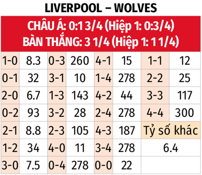 - Liverpool thắng châu Á hiệp 1: Lịch sử đối đầu chứng kiến Liverpool toàn thắng châu Á hiệp 1 ở 4 trận gặp nhau gần nhất. Trước một Wolves đang khủng hoảng, The Kop khả năng sẽ chủ động đánh phủ đầu để tìm kiếm lợi thế dẫn bàn sớm.