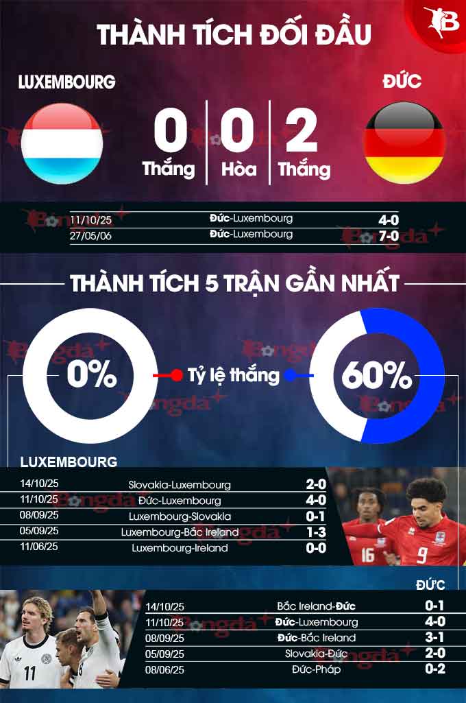 - Hai đội không cùng ghi bàn: Luxembourg đã không ghi bàn ở 5/6 trận gần nhất. 4/5 trận gần đây của Đức cũng luôn có đội "tịt ngòi".