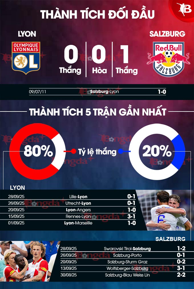 - Hai đội cùng ghi bàn: Lyon đã thành công trong việc ghi bàn ở 5 trận gần nhất còn với Salzburg là ở 3/5 trận vừa xong. Bên cạnh đó, Lyon cũng ghi bàn ở 3 trận chính thức gần nhất trên sân nhà, còn với Salzburg là 4 trận vừa qua tại sân khách. Với xu hướng như vậy, khả năng cao hai đội sẽ cùng tìm được đường vào khung thành của nhau.