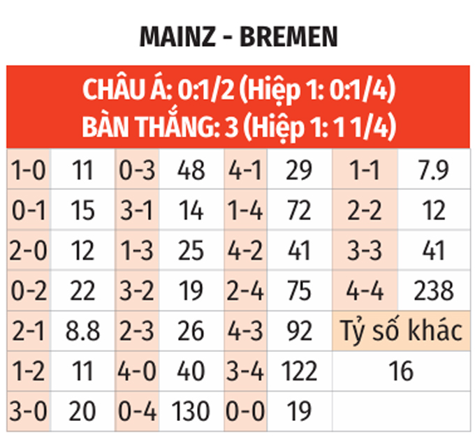 Bên cạnh đó, trong 10 lần tiếp Bremen, Mainz chỉ thắng có 2, hòa 1 và thua tới 7. Nhiều khả năng, 3 điểm sẽ về tay Bremen.