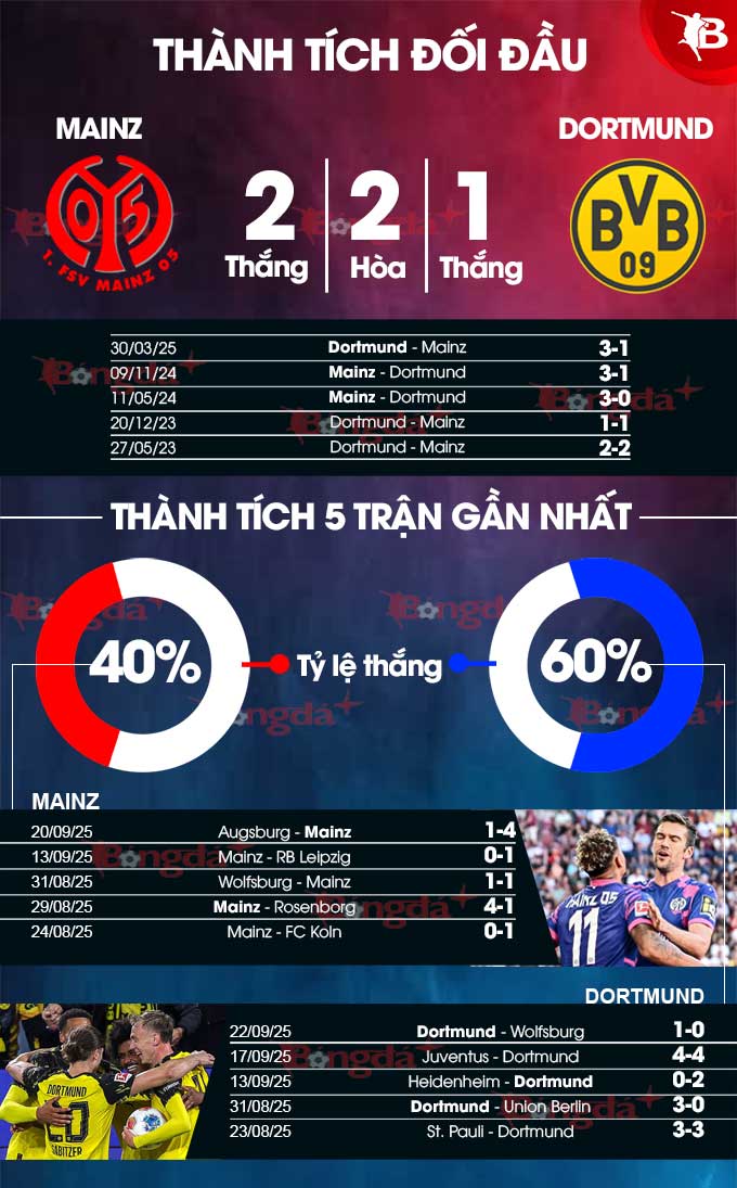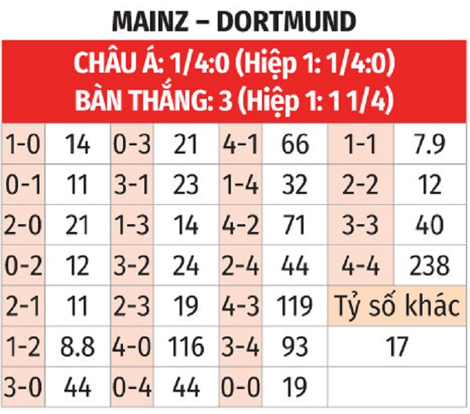 - Từ 3 bàn thắng trở lên: 5/6 trận đối đầu gần nhất giữa hai đội đều xuất hiện ít nhất 3 tình huống ghi bàn. Hàng công Mainz nổ súng 9 lần ở 4 trận vừa qua trên mọi đấu trường. Với Dortmund, các chân sút của họ ghi tới 27 bàn thắng ở 8 trận sân khách vừa qua.