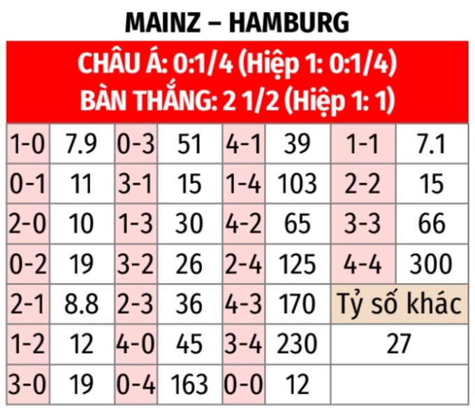 • Tối thiểu 1 bàn hiệp 1: 7/10 lần gặp giữa 2 đội gần đây đều có ít nhất 1 bàn thắng trong hiệp 1. Tình trạng tương tự xảy ra ở 7 trận gần đây của Mainz và 3 trận gần nhất của Hamburg.