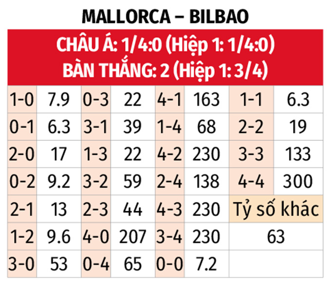 - Mallorca thắng châu Á: Mallorca thắng châu Á 5/8 trận sân nhà gần đây. Với Bilbao, đội khách không thắng châu Á 6 trận liên tiếp, trong đó có 5 trận thua và 1 trận hòa. Mallorca toàn thắng châu Á 4 trận tiếp đón Bilbao gần nhất được nhường 1/4 trái như trận này.