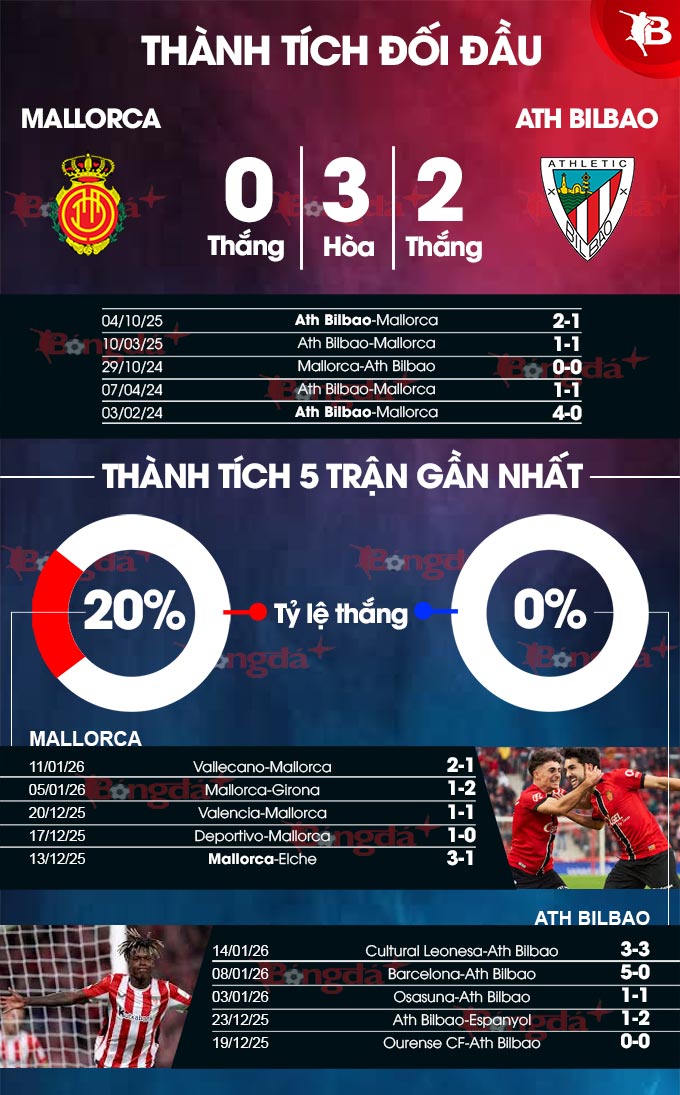 Bilbao đang lấn lướt Mallorca về thành tích đối đầu với 8 trận bất bại, nhưng có tới 6 trận bị chia điểm.