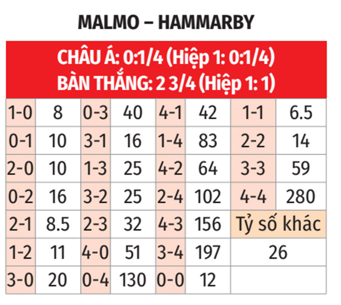 - Tối thiểu 3 bàn: 7/8 trận gần đây của Hammarby đều có không dưới 3 bàn. 4/6 trận vừa qua của Malmo số lần lưới rung cũng đều trên mức 2.