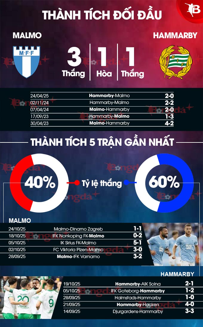 Không chỉ hưng phấn nhờ đà thắng như chẻ tre, Hammarby còn được lịch sử ủng hộ nên họ hứa hẹn sẽ là thử thách lớn dành cho Malmo. Nên biết, trong 8 lần chạm trán Malmo gần đây, Hammarby chỉ thua đúng 1 trận và họ có 3 lần đánh bại đối phương. Với thói quen tích cực như vậy, rất có thể Hammarby sẽ lại thu được kết quả khả quan dù phải thi đấu xa nhà.