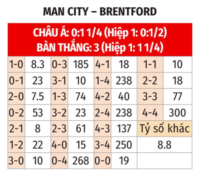 - Man City ghi bàn hiệp 1: Man City ghi bàn trong hiệp 1 ở 6/9 cuộc đối đầu gần nhất, ở cả 5 trận gần đây. Ngoài ra, đội bóng của HLV Pep Guardiola cũng làm được điều tương tự trong hiệp 1 ở 5/6 trận sân nhà vừa qua. Thật trùng hợp khi Brentford đều để thủng lưới ít nhất 1 bàn trong hiệp 1 ở 3/4 chuyến làm khác gần đây.