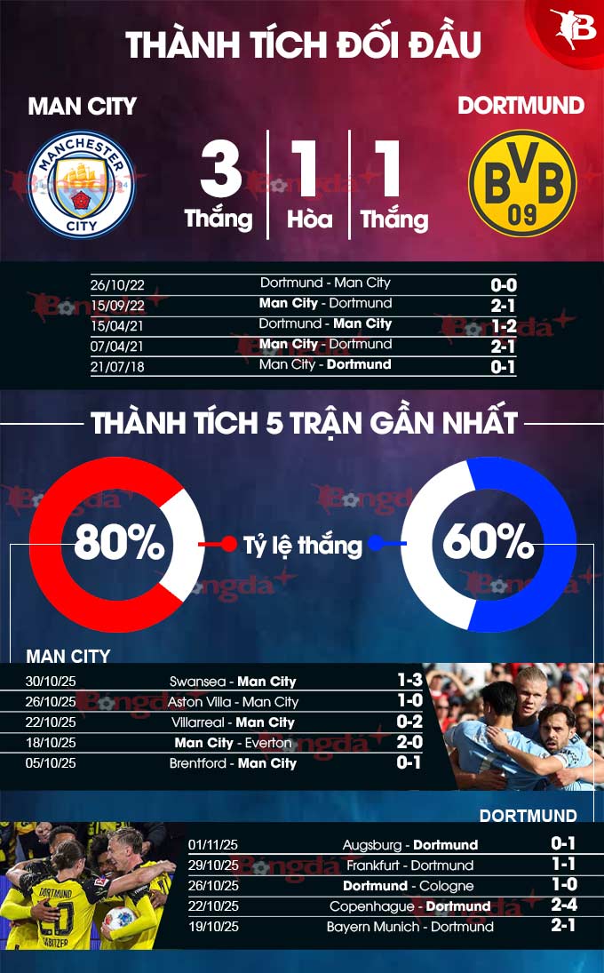 - Tối đa 3 bàn thắng: 8 lần đối đầu giữa 2 đội gần đây đều xuất hiện không quá 3 bàn thắng. 4/5 trận gần đây của Man City ở 2 mặt trận Premier League và Champions League cùng 5/6 trận vừa qua của Dortmund xảy ra tình trạng tương tự.