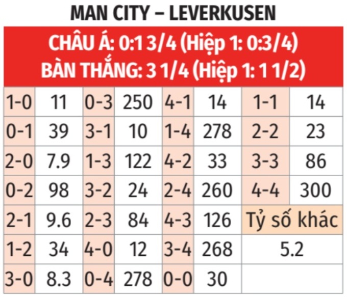 - Lẻ bàn thắng: Cả 3 trận đấu gần đây của Man City đều kết thúc với tổng số bàn thắng là số lẻ. 4/6 trận gần nhất của Leverkusen xảy ra tình trạng tương tự.